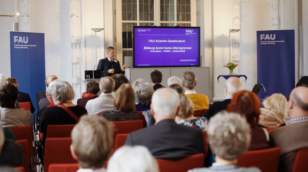 Das FAU Scientia Gaststudium bietet eine breite Palette an fachspezifischen universitären Lehrveranstaltungen für Menschen, die ihren Horizont erweitern möchten – sei es neben oder nach ihrem Beruf. Zusätzlich zu den regulären Angeboten des allgemeinen Lehrbetriebs organisiert die FAU Scientia spezielle Lehrveranstaltungen für ihre Gaststudierenden.